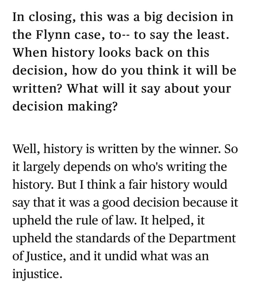 That is some MAJOR editing in my opinion. He left out the key part of the answer the AG gave. The disgusting part of this is the WHY. If NBC really wanted an honest debate about the motives of that decision then WHY wouldn’t they provide his entire answer and begin the debate there? It’s a simple answer and a rather disturbing one….. they have a narrative that they are going to stick with. They are going to ignore the facts, hide them, edit them and run the story through their biased filter and feed it to the American people so they can continue their malicious war against General Flynn.