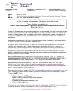 On March 25, Governor Cuomo issued a mandate that nursing homes were required to readmit any patient from a hospital regardless of their Covid status? On May 10, he reversed this directive. As of May 22, they have determined that over 4500 patients with Covid were sent into nursing homes. Twice as many people died in NY nursing homes than in the entire state of Florida.