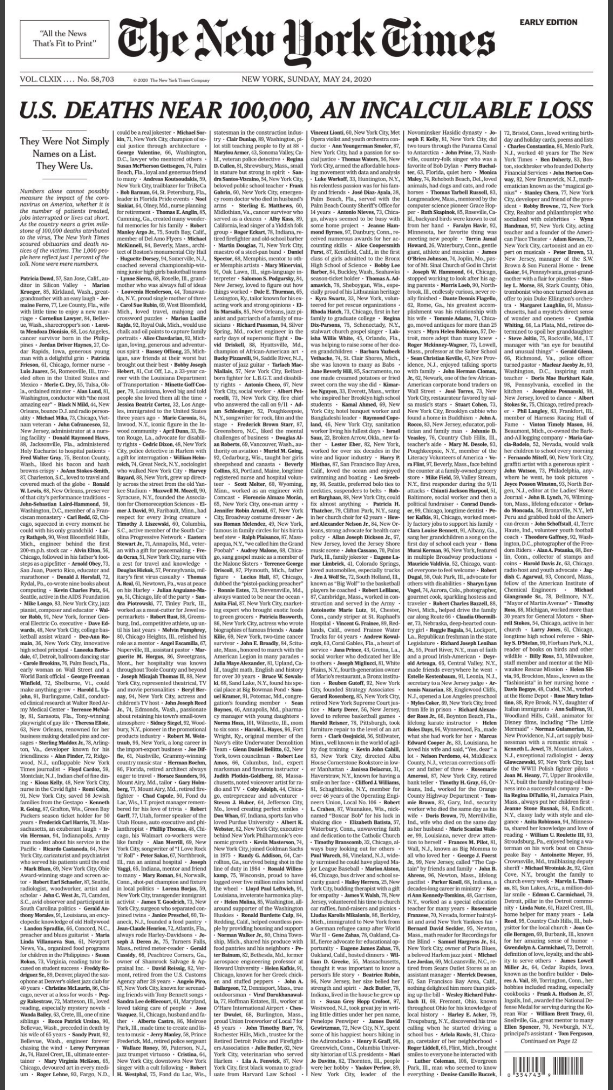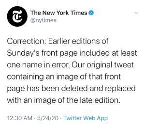 Then, we can move on to the NY Times… The Beacon of Truth. Certainly their standards for accuracy should be extraordinarily high, but they aren’t. They took the time on Memorial Day weekend to run a front page list of ALL of the people that have died from Covid in the US. But they even got that wrong. Are you going to give them a pass.. say it’s just an error? It’s only 1 name out of 100,000… really? How do you know that? Every lost life matters and it really matters to their families so why doesn’t it matter to The NY Times? Why is it up to other news organizations or journalists to have to fact check the story run on the FRONT PAGE of the NY Times? Here’s their front page and a correction. Notice the wording… they’ve already laid the groundwork for more incorrect names to be removed. (*at least one name)