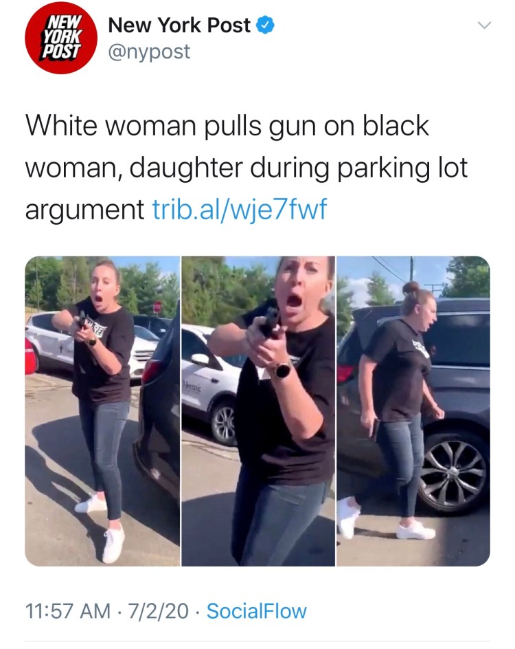 The headline makes this seem like a clear cut racist attack by a white woman. Let me give you the FACTS behind the headline and the photos… A white woman ALLEGEDLY bumps into a black teen. Black teen calls her racist. Her black mom then harasses the white woman for several minutes and threatens to beat her ass. The white woman tries to drive away, the black woman follows and hits her car. The white woman then gets out of her car and pulls the gun. So… yes… the NY Post had it mostly right… they did manage to correctly identify the races of those involved. No wonder their publication is commonly referred to as “bird cage liner”.