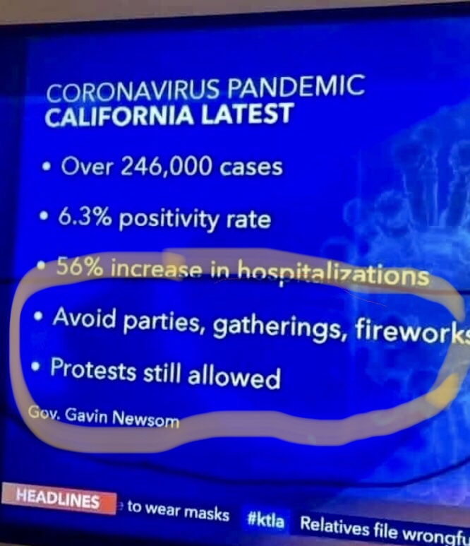 CNN managed to praise the Black Lives Matter protests while criticizing 4th of July celebrations. They heaped praise on the 26 million who have taken to the streets to march while demonizing backyard BBQs and family get togethers. Of course CNN is not solely to blame for that attitude….. look at what Governor Newsom (D-CA) mandated for the weekend!