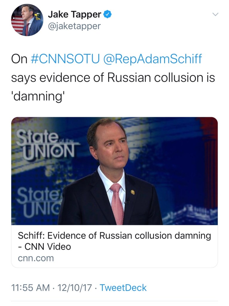 I am still waiting for CNN to reveal the irrefutable evidence that Rep Adam Schiff (D-CA) has had in his possession for 3 +years. Now… you can continue with the buffoonery that Trump and his campaign colluded with the Russians to win the election but at this point you look like the rear end of a donkey. There have been so many documents released over the past 2 months that any lingering belief you have, should vanish like the wind.