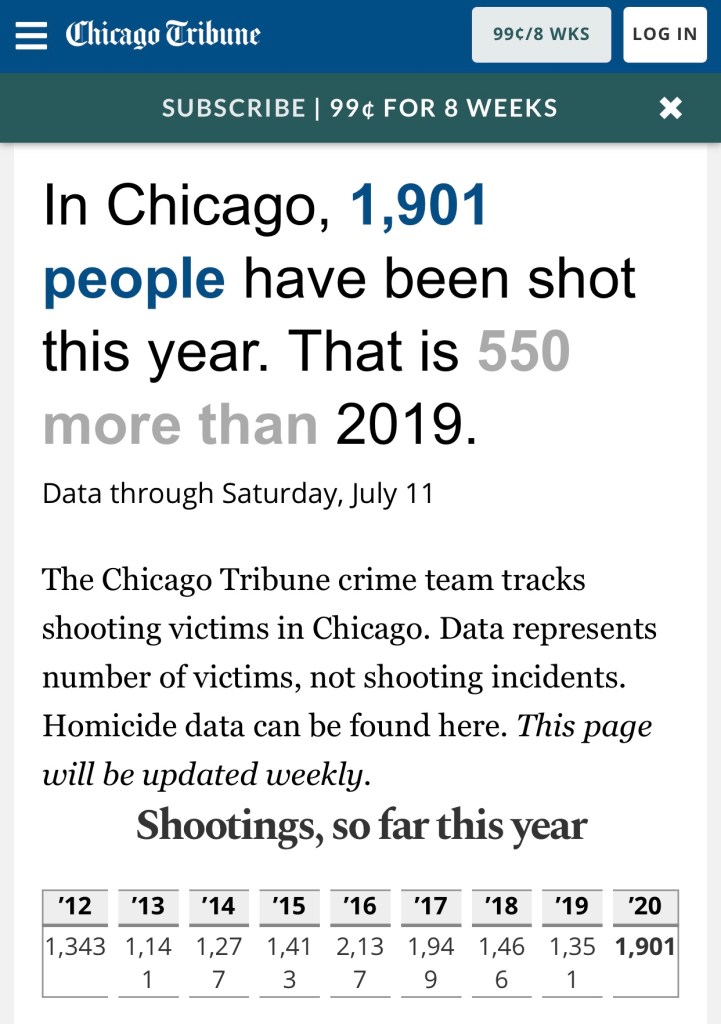 There have been 373 killed so far in 2020. In the past 5 days there have been 112 shot and 19 killed. It is time for Mayor Lightfoot to admit she has a problem.