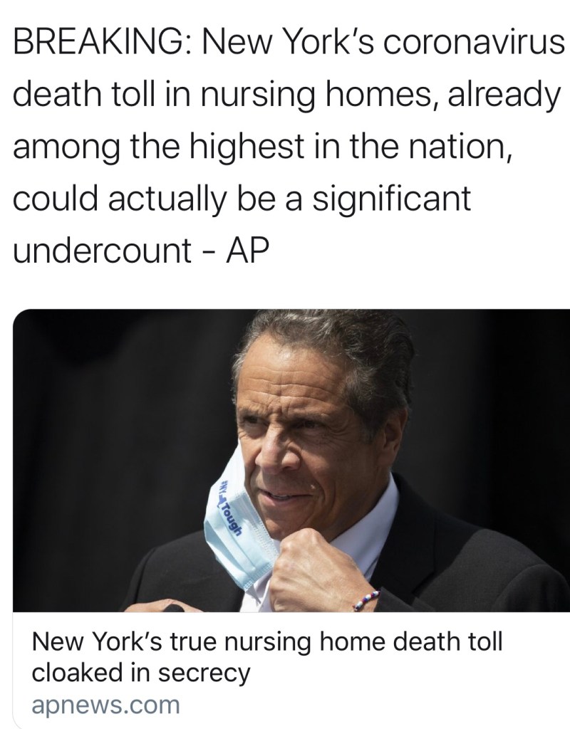 Andrew “Venthoarder” Cuomo killed more nursing home patients than we were told. His mandate was a death sentence for thousands of elderly people. The AP wrote this and you should read it. :