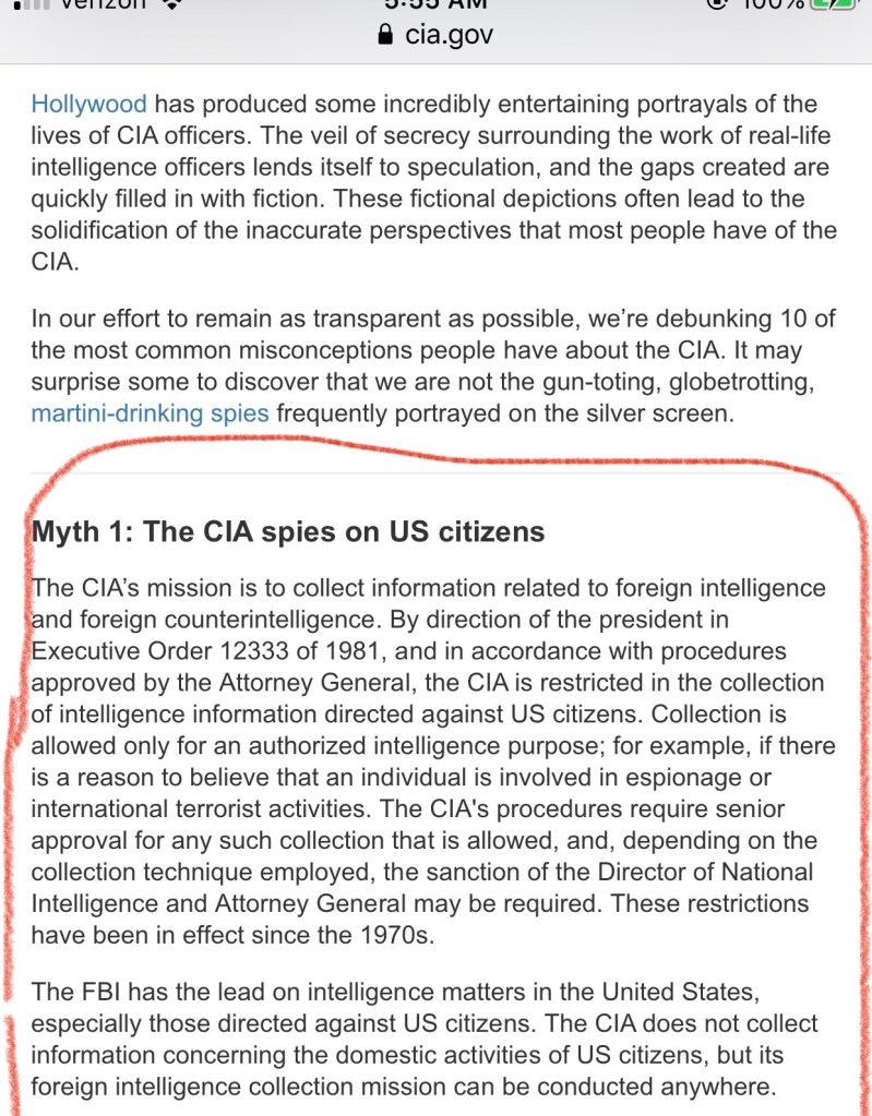 I’m going to put this here for you to read. Familiarize yourself with the actual rules regarding the CIA’s ability to investigate and collect intelligence on U.S. citizens in the United States. John Brennan was the Director of the CIA for President Obama.
