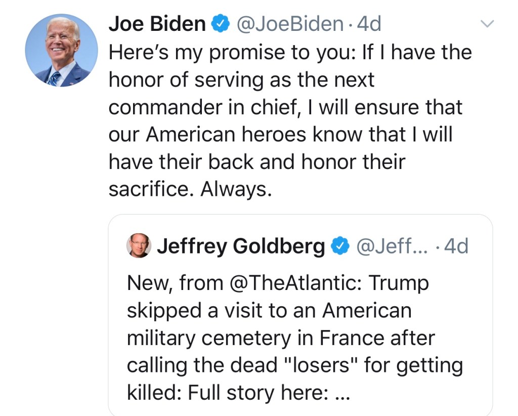I did not read the news much over the long weekend but I did see a couple of eye poppers. Remember the story that almost EVERY media outlet in the land ran with about Trump calling Veterans “losers”? I actually saw people on Social Media addressing it as if it was a truthful story…. “I served in the military, how dare he call me a loser”, “I knew he was a Veteran hater” even Joe Biden got into the fray.