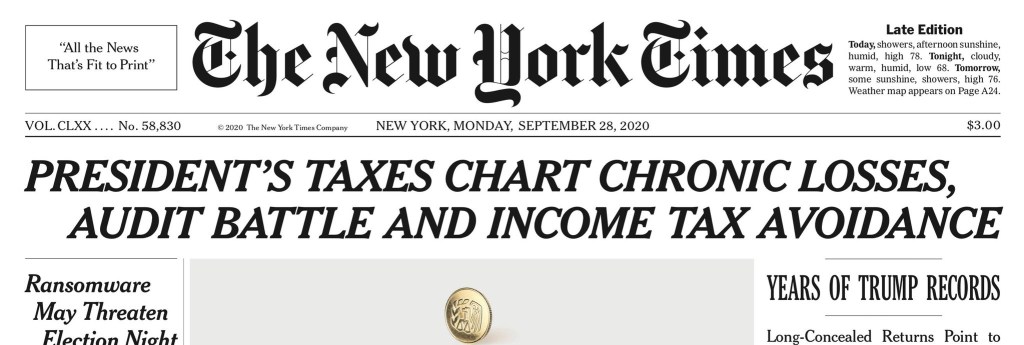 Most Americans don’t give 2 shits about Donald’s tax returns. You might think they do because you follow the news and you’ve seen the stories written over and over and over about how he is “the only President” in the past few decades that has NOT provided those documents for us average ordinaries to peruse. BUT… you are wrong. I’ll be honest with you…. this story is NOT as big as you might think it is or even want it to be. It’s just not. We are 40+ days from the election and this story is NOT going to move the needle in any direction no matter how much you might hope it does. There isn’t a single voter out there that woke up Monday morning and said, “Ah Ha! I knew it… his finances are wonky and I’m NOT voting for him” IF that’s what you think this story is going to result in…. you will be very disappointed.