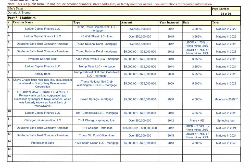 Now, the debt. Those numbers are all over the place but I think the most common one I’ve seen thrown about is $400 million. Those are loans that can be called beginning next year. They can also be extended. Anyone with wealth invested in real estate such as he has…. has debt and probably as much if not more than him. This number although very large in our eyes is really not that large and if you are searching searching searching for who holds that debt… who is he beholden too?? Banks. Lots of them.