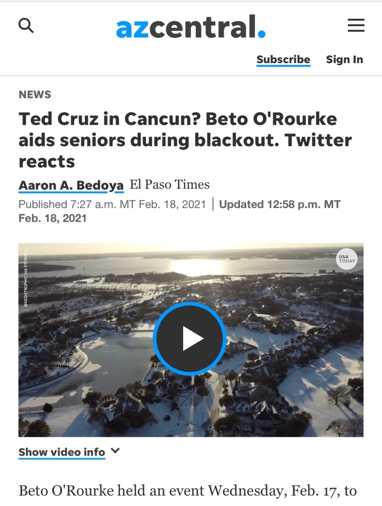 It’s really a rather disgusting trend if you want my honest opinion on it. One nugget… one photo… and the entire media industry goes into operation analyze, commentate, and overdrive. He’s a SENATOR! He’s not a Mayor or Governor so his ability to effect the actual “on the ground game” of distributing supplies and rescuing citizens is nonexistent. He’s not a licensed plumber or electrician so I don’t think he’s gonna be too useful in fixing the electric grid or repairing a busted water pipe. He doesn’t own a trucking company so he’s not gonna be hitting the streets with an 18 wheeler loaded with water and medical supplies. He’s a SENATOR! He can get things done with that device that every damn one of you have within arms reach….. a phone. And.. the last time I checked, Cancun does in fact have cellular service. So, what he could do from his kitchen table in Houston, he could also do from a beach chair in Cancun.