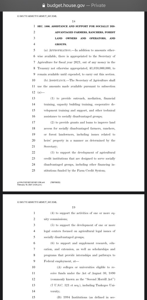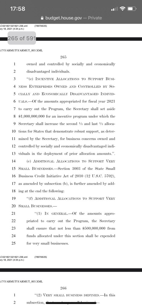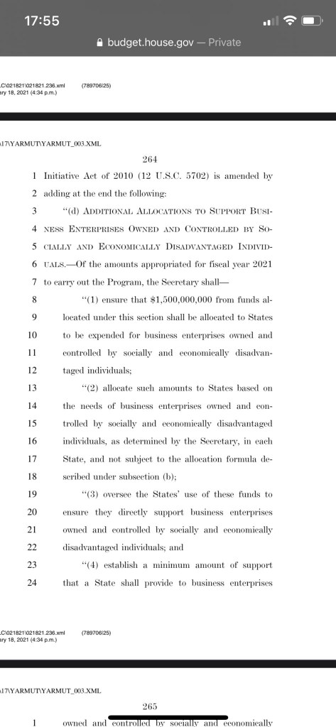 $1.5 BILLION for “businesses owned and controlled by socially and economically disadvantaged individuals” …. then they follow it up in the very next paragraph with ANOTHER $1 BILLION just to be sure there’s enough to go around for these peeps! Guess they thought….meh… if we split it in 2 paragraphs maybe the lowly ordinaries won’t notice we’ve got $2.5 BILLION in there cause they think we can’t add!