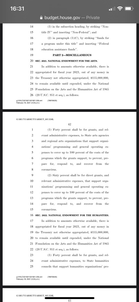 $135 MILLION for the National Endowment of the Humanities AND $135 MILLION for the National Endowment of the Arts. Somehow these 2 entities end up with hundreds of millions EVERY damn time there is cash to be handed out!