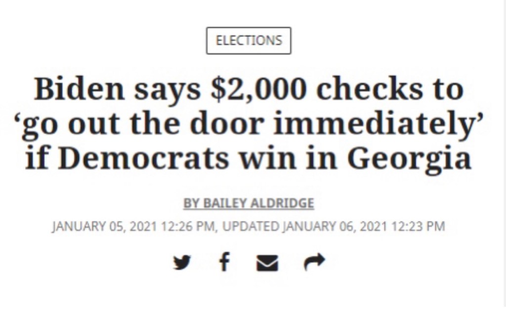 We were promised….. in case you need reminding that IF the people in Georgia voted Democrat for those 2 Senate Seats we would get a check for $2,000 on DAY ONE of President Biden’s term. Well…. what do we want to call that?? A LIE??!!