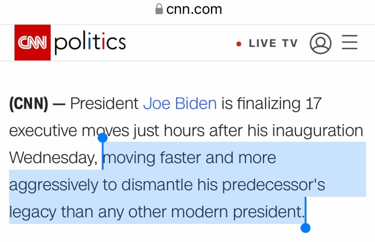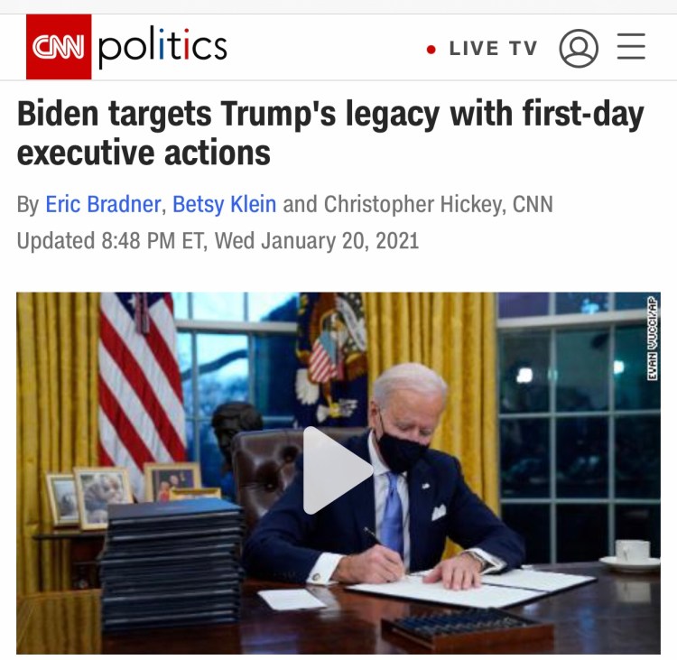 Look into how many executive orders were signed within HOURS of his inauguration. No discussion, no debate, just sign and go. Seems like that’s a bit childish to me. It was more important to Un-Do things out of spite than to carefully weigh which policies were working and which were not. Issuing executive orders or repealing them because of WHO signed them before is immature, irresponsible, and stupid.