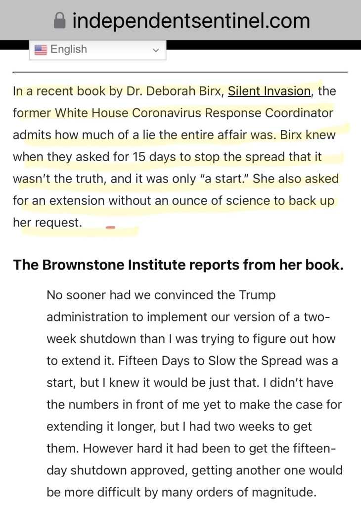15 Days to Flatten the Curve. That whole bullshit strategy wasn’t based on science. They insisted that every single thing they deemed necessary during COVID was based on Science. The scarf wearing lying twit Dr. Deborah Birx admitted in her book, Silent Invasion, that science didn’t play a part in much of it. ”When we asked for 15 days to stop the spread, we knew it wasn’t the truth and only a start. The minute the 15 days was approved by the White House as a strategy, we got to work on making a case to extend it.”